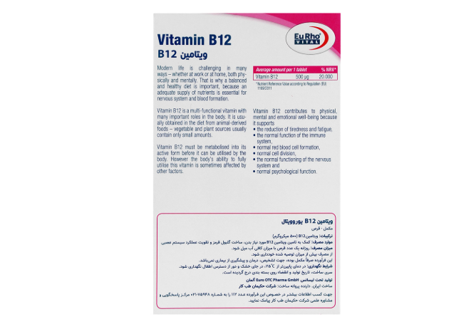 ویتامین B12 یکی از مهمترین ویتامینهای گروه B است که نقش حیاتی در سلامت سیستم عصبی، تولید گلبولهای قرمز خون و عملکرد متابولیسم بدن دارد. کمبود این ویتامین میتواند باعث خستگی مزمن، ضعف، مشکلات عصبی و اختلال در عملکرد مغز و حافظه شود. قرص ویتامین B12 یوروویتال 500 میکروگرم با فرمولاسیون دقیق و تولید تحت لیسانس Euro OTC Pharma GmbH آلمان، یک راهکار مطمئن برای تأمین نیاز روزانه بدن به ویتامین B12 و پشتیبانی از سلامت عمومی است.